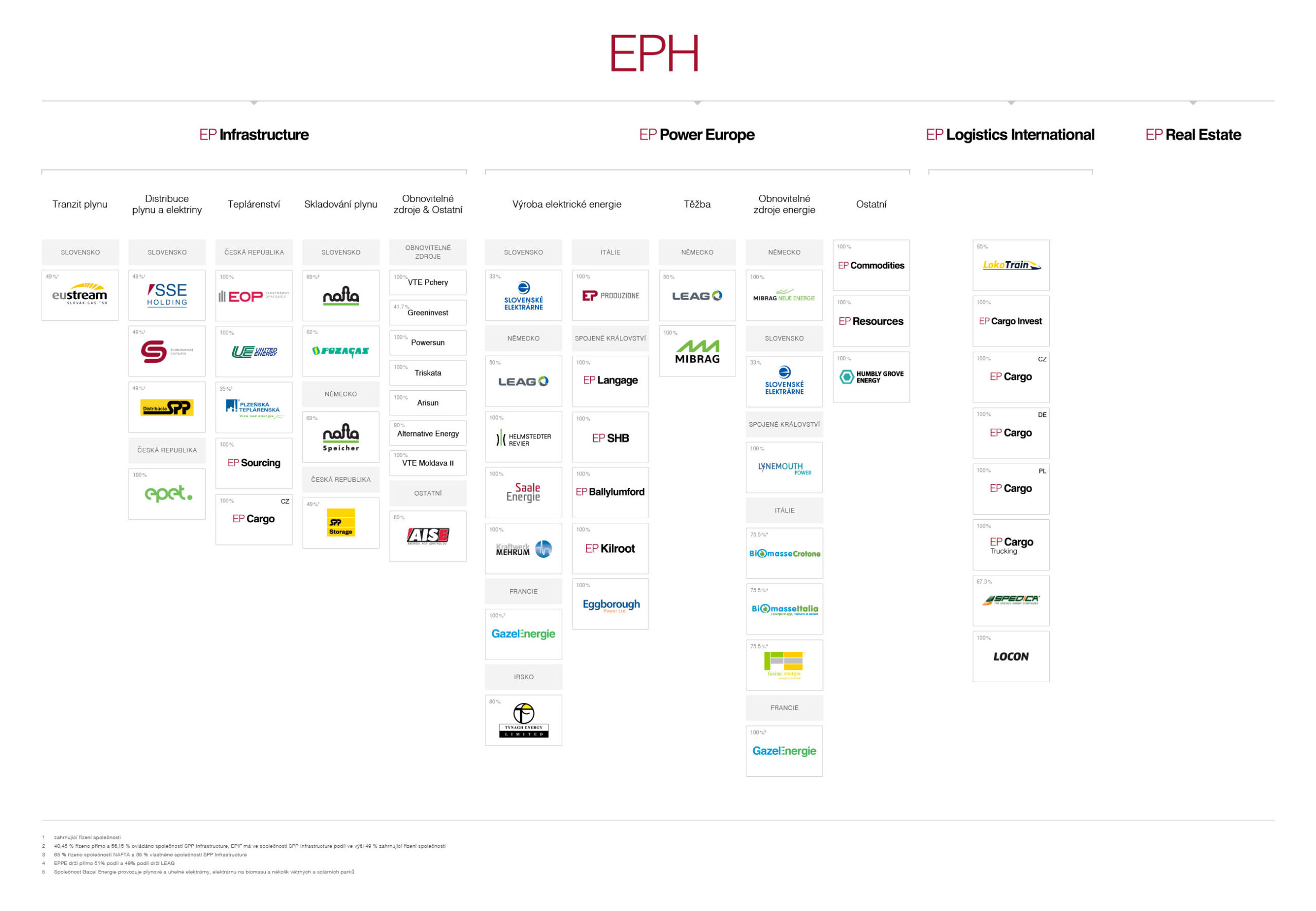 Skupinu EPH tvoří více než 70 společností strukturovaných do čtyř pilířů – EP Infrastructure, EP Power Europe, EP Logistics International a EP Real Estate.